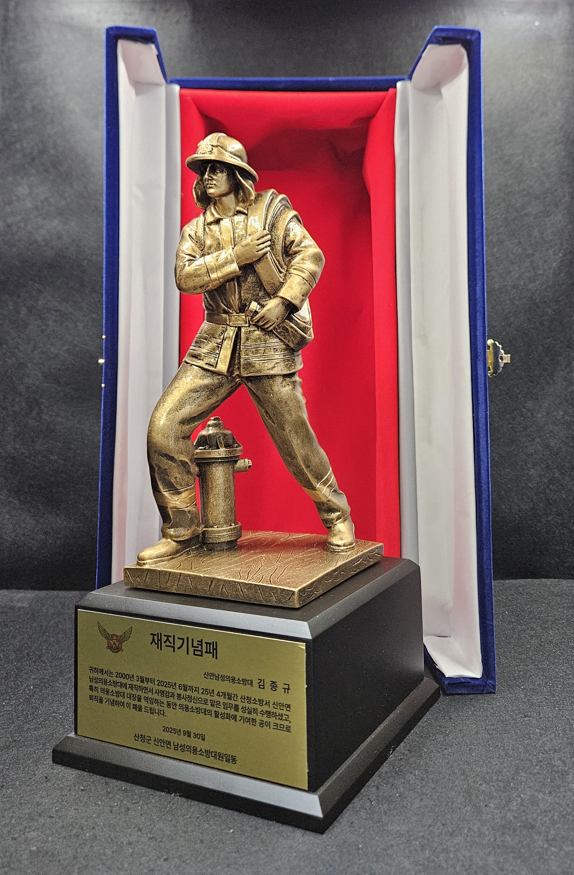 | 명예로운 퇴임을 맞이하신 남성의용소방대 대원분께 드리는 소방관트로피 의용소방대감사패 공로패 퇴임패 퇴직패 재직기념패 소방관상패 제작 (1) | 2026.01.30 |