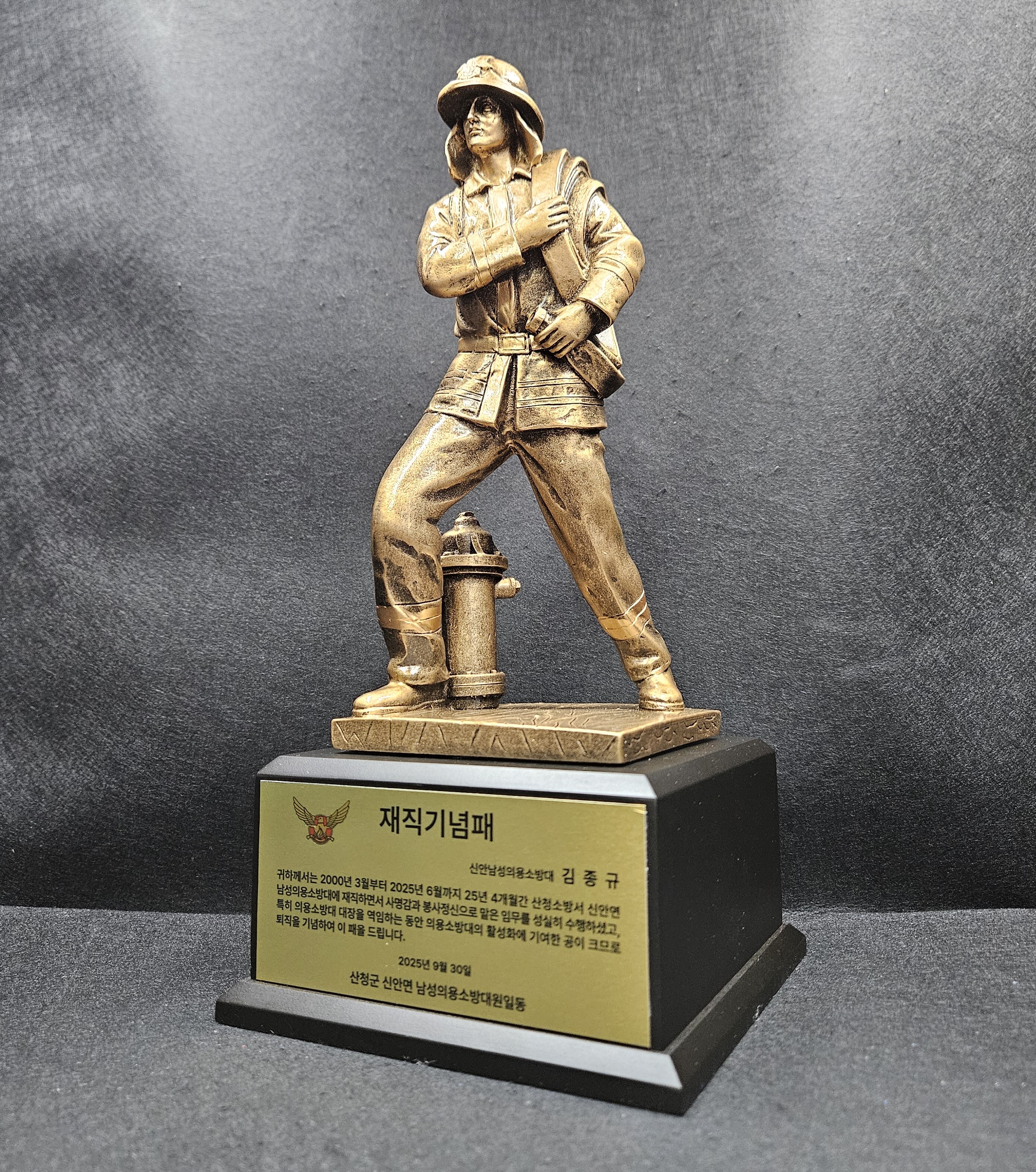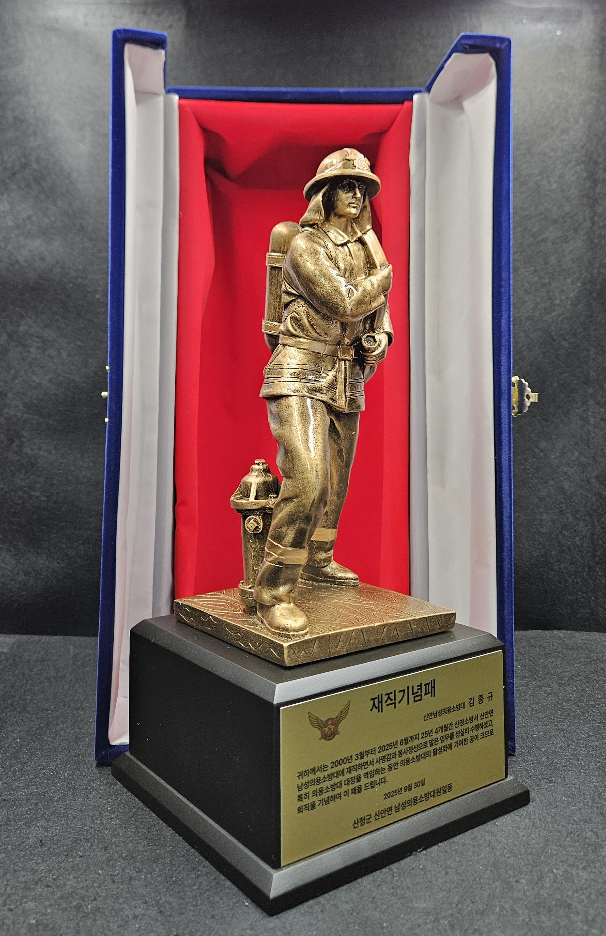 | 인생 2막을 시작하시는 대장님께 드리는 소방관트로피 소방관재직기념패 제작 (5) | 2025.12.16 |
