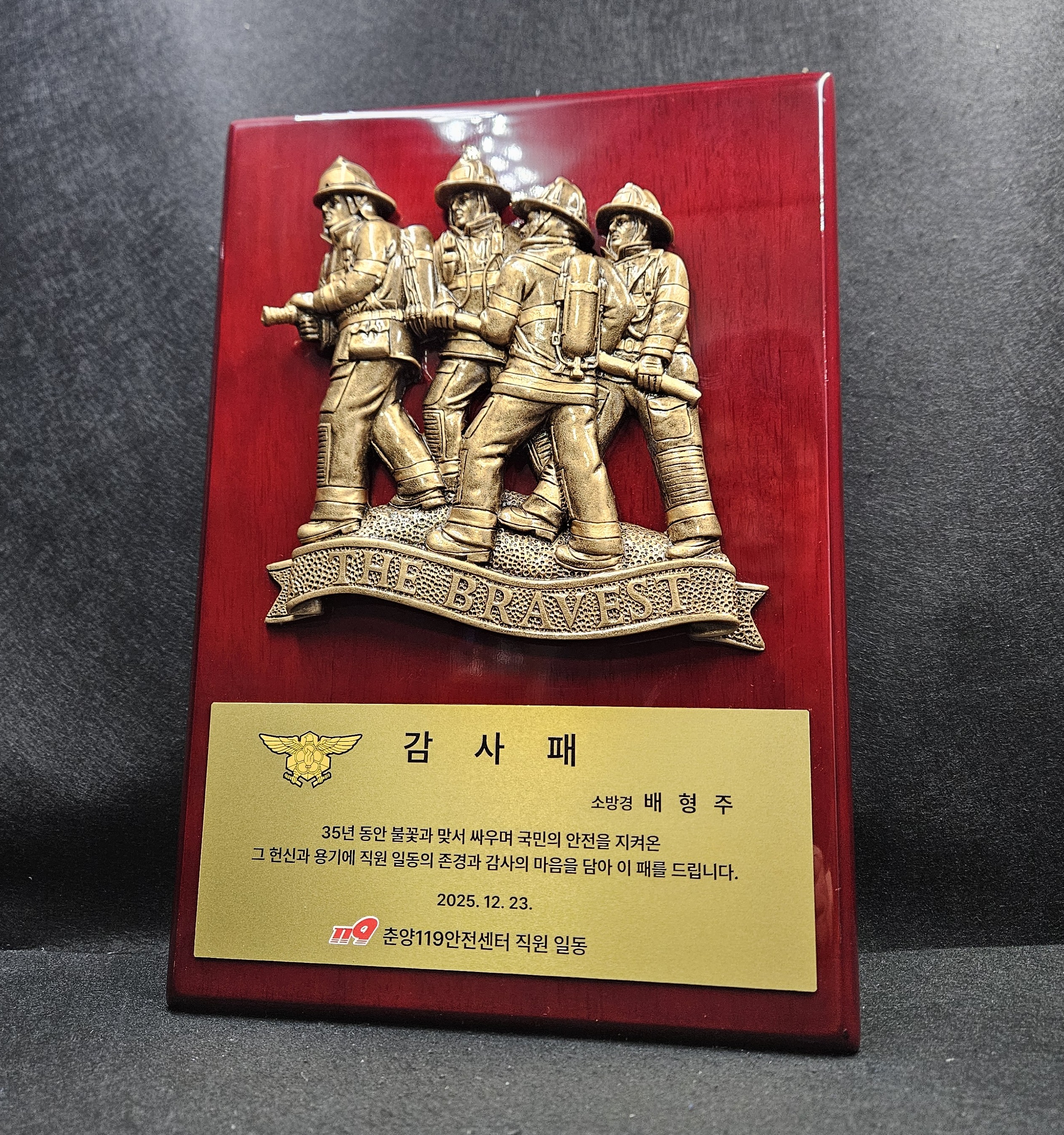 | 인생 2막을 시작하시는 대장님께 드리는 소방관트로피 소방관재직기념패 제작 (5) | 2025.12.16 |